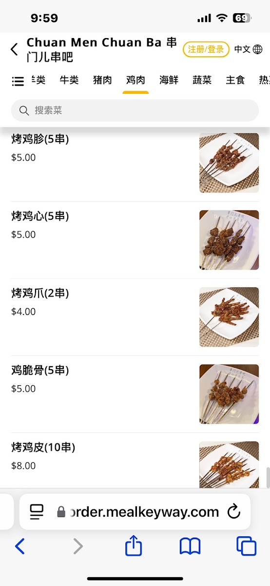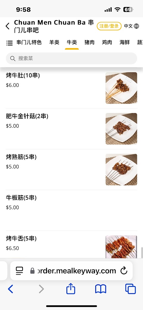 Tender fatty beef skewers paired with enoki mushrooms, grilled and sprinkled with sesame seeds. Two pieces per serving.The skewer has no stick 烤串没有签子